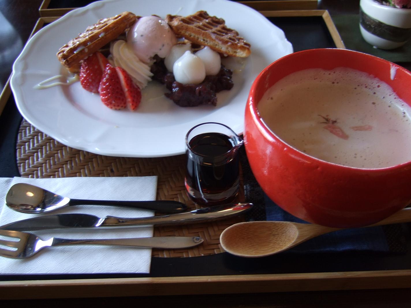写真は桜のカプチーノとワッフル。